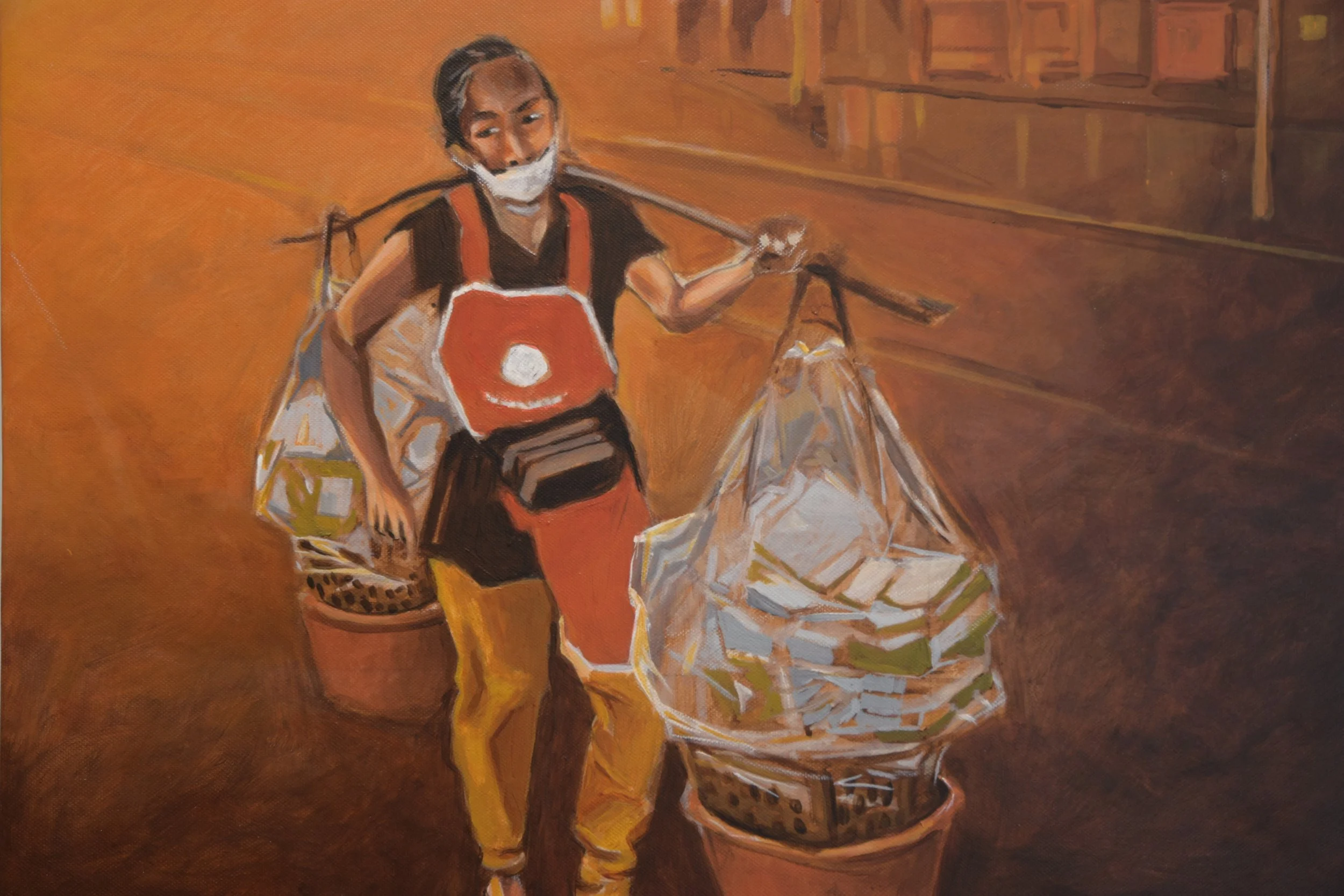 Low-wage laborers in Asia deliver much needed workers in construction, farming, food service, logistics, and more. With little or no benefits such as paid leave or retirement income, they work six to seven days a week with a minimum of government health insurance. Often men and women in their 60s work at jobs requiring long hours and hard labor. In this painting based on a series of photos which I took, this elderly woman is delivering supplies to a merchant located inside the central railway station in Bangkok. The color palette was inspired by Caravaggio.