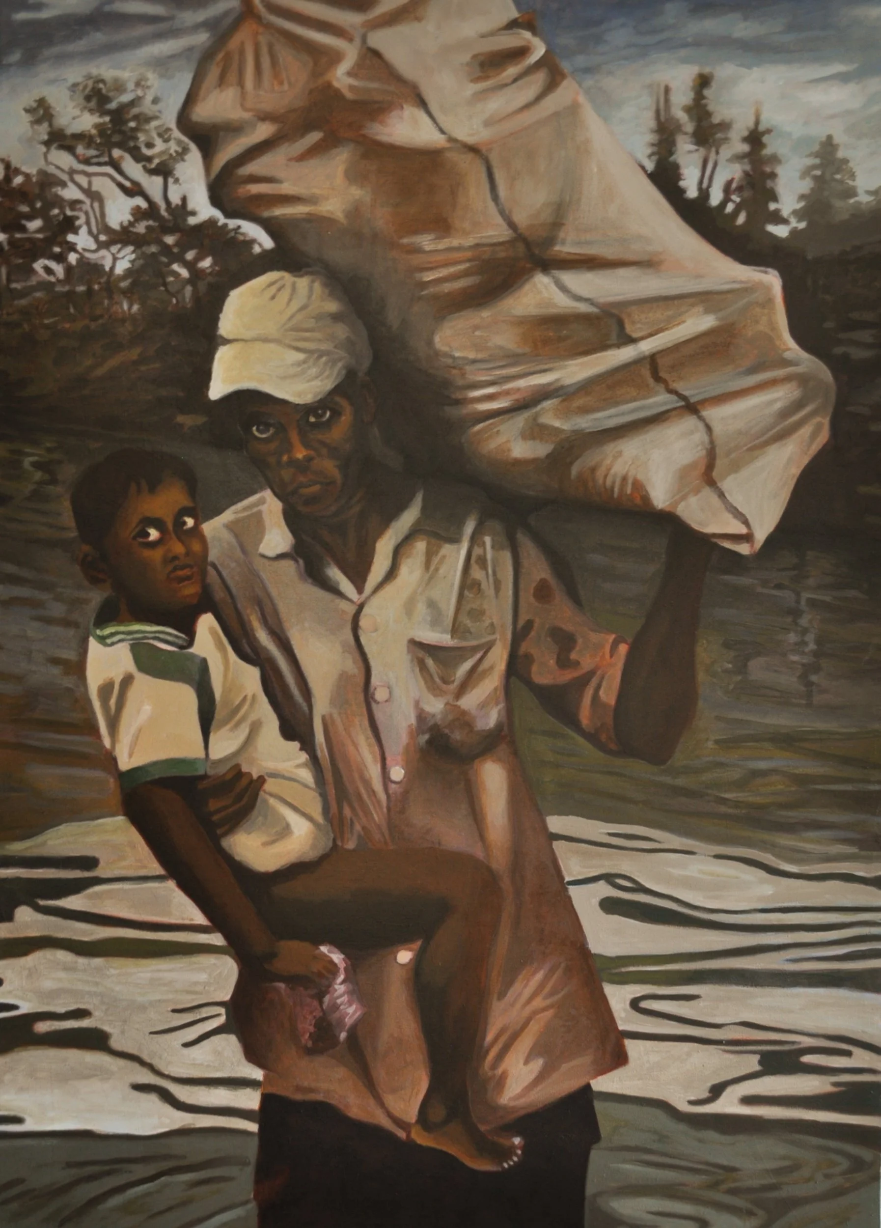 Persecuted and forced displacement along the Rakhine border with Bangladesh the look of despair and fear in the eyes of both father and child piqued my interest to re-create on canvas what photographer Patrick Brown captured in his photo.